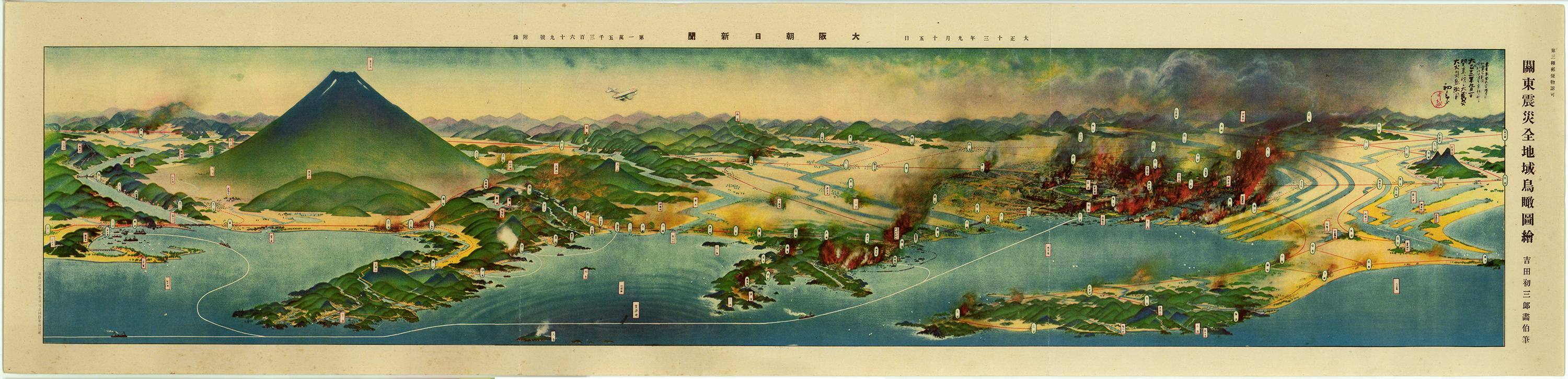 우선 위의 사진은 지진 1년 후 그려진 당시 대표적인 조감도 작가 吉田初三郞(요시다 하츠사부로)가 그린 작품이다. 동경지역을 비롯하여 인근의 요코하마 등지가 지진으로 큰 화염에 휩싸여있는 모습이다.