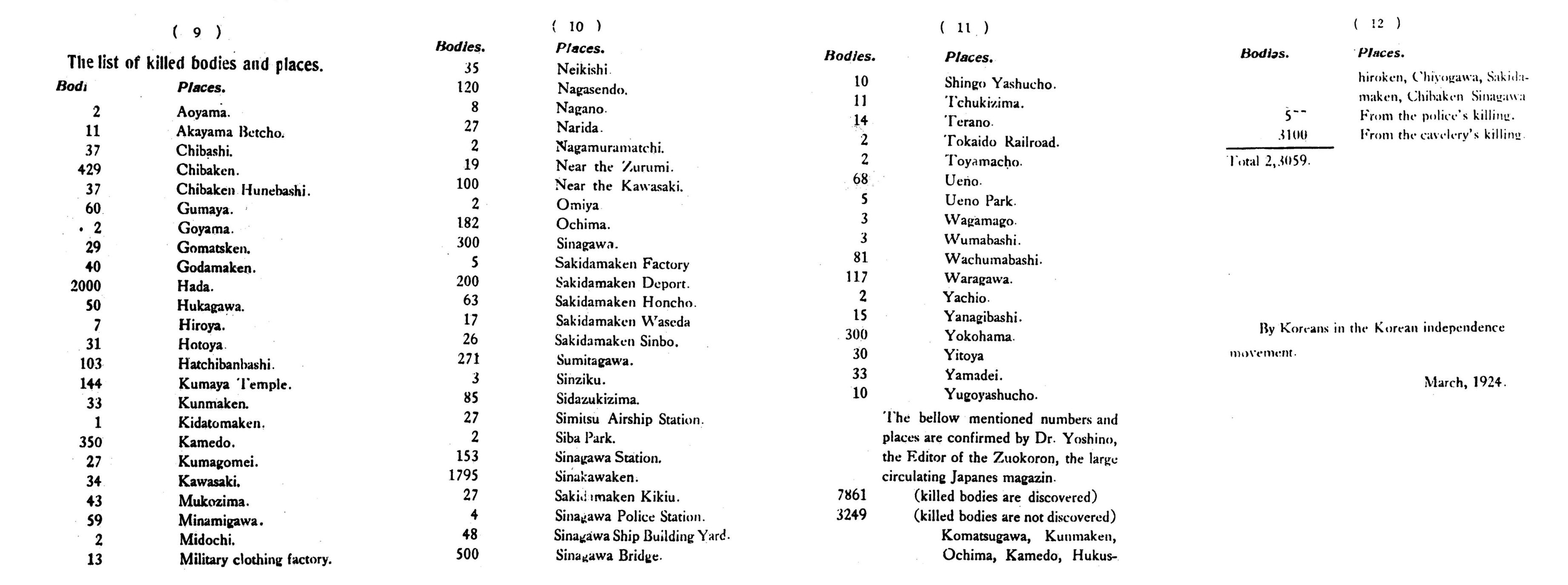 물론 1923년 당시 도쿄를 비롯한 이른바 관동지역의 재일 조선인의 숫자가 정확히 얼마인지는 모르겠지만, 2만명을 넘는 조선인이 사망하였다는 것은 조금 더 살펴볼 필요가 있기는 하다. 자료에서 이 숫자가 한국의 독립운동가들에 의한 자료라고 명기되어 있을 뿐 아니라, 학술대회 때 발표자도 당시 지식인 요시노 사쿠조(吉野作造)에 의해서 확인된 숫자는 14,747명이라고 하고 있기 때문이다.(아래 학술대회 보도자료 링크 참조) 그래서 2만여명을 넘는 여부는 확정할 수 없더라도 6,000여명대를 훨씬 넘는 숫자라고 이야기 하고 있다. 그렇지만, 10년이나 지난 시점에서도 아직까지 공식적인 학살 피해자 수는 6,000여명대로 규정되고 있다.